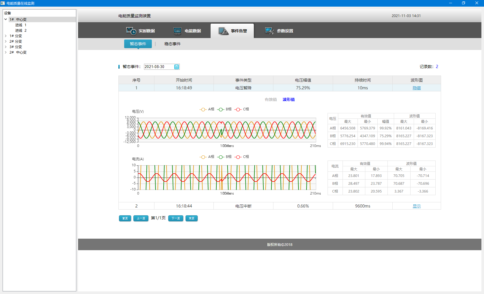 監測微電網重要回路的電壓波動與閃變、電壓暫升/暫降、短時中斷情況,實時記錄事件并故障錄波,為電能質量分析與治理提供數據來源。及時采取相應的措施提高配電系統的可靠性,減少因諧波造成的供電事故的發生。
