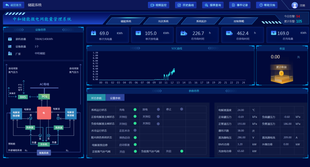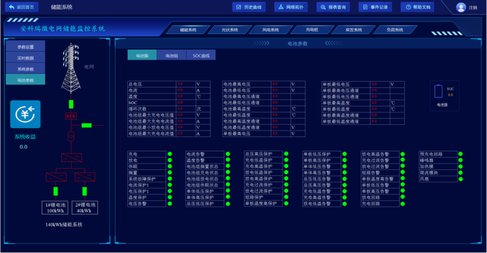 微電網能量管理系統是儲能系統與運行人員聯系的主要方式,系統可提供重要參數的顯示和必要操作,包括儲能系統主要儲能裝機容量、單次充放電量與時間、SOC曲線、收益及儲能系統運行狀態參數,手動和自動控制,控制調節對象包括直流開關、各電壓等級的電動操作開關、主要設備的啟動退出、PCS功率設定、裝置運行參數設定等。
