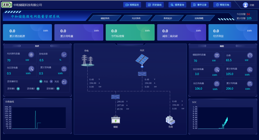 監測儲能系統、電池管理系統(BMS)和儲能變流器(PCS)運行,包括運行模式、功率控制模式,功率、電壓、電流、頻率等預定值信息、儲能電池充放電電壓、電流、SOC、溫度,根據企業峰谷特點和電價波動設置儲能系統的充放電策略,控制儲能系統充放電模式,實現削峰填谷,降低企業用電成本。